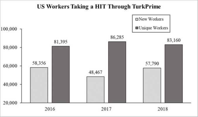 Amazon advertises more than 500,000 registered workers. Yet academic researchers have estimated that the average lab has access to less than 10,000 people in any three-month span (Stewart et al., 2015) and the total number of active people may be around 100,000 (Difallah, Filatova, & Ipeirotis, 2018).