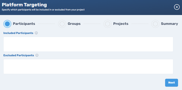 Platform Level Targeting. Not only is it easy to target a vast range of demographics, it is also easy to select particular participants to include or exclude, based on participant IDs, participant groups, or specific projects they’ve participated in.