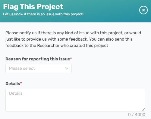 Project Feedback and Researcher Ratings. One thing we learned from our Connect community is that participants like to have their voices heard. In most other online platforms, however, there is no mechanism for participants to tell researchers about an issue with a project or to report when projects or researchers violate a site’s terms of service. To give participants a voice on Connect we created a system for real-time project feedback and a separate system for rating a project and researcher after the project is complete.