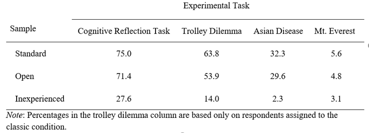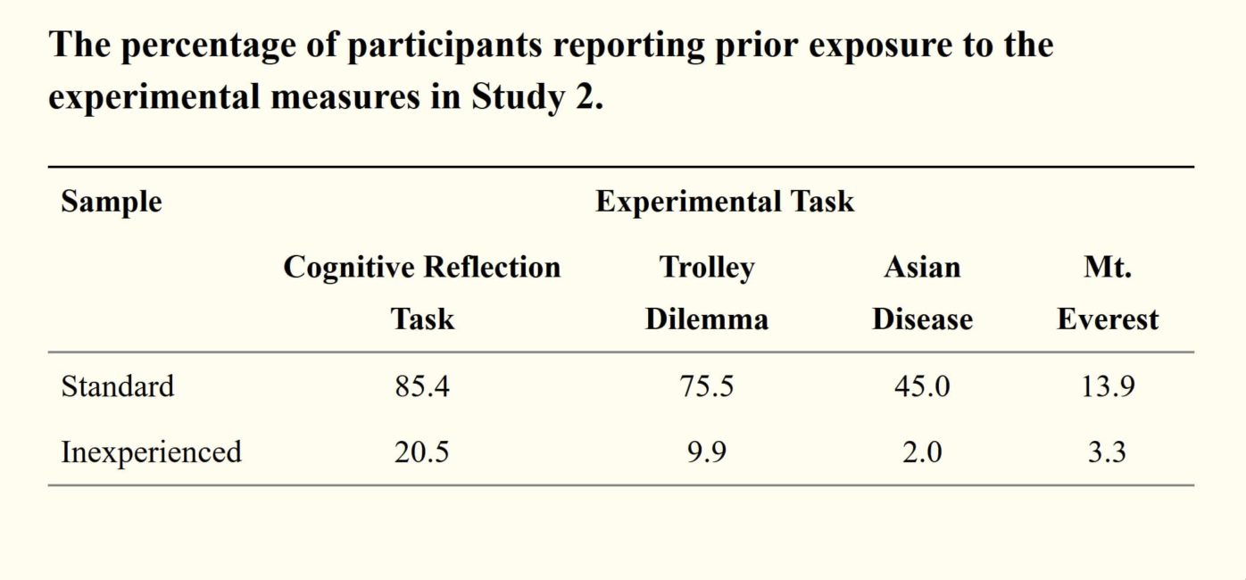 After participants completed each experimental task, we asked if they had ever seen the task previously. Their responses are in Tables 1 and 2. On three of the four tasks, inexperienced participants reported much less prior exposure than the experienced participants. Altogether, the results of our studies suggest researchers may be able to recruit naive participants on MTurk who provide quality data.